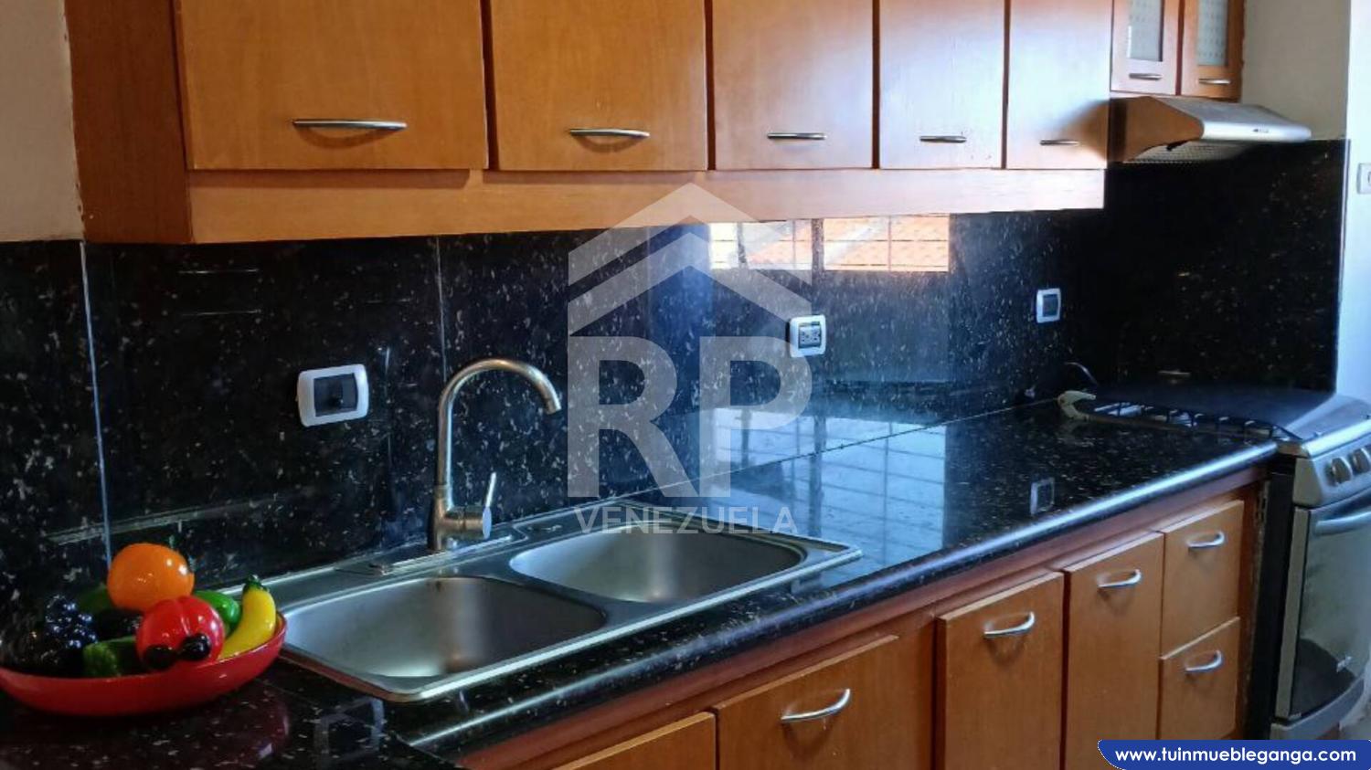 La cocina empotrada destaca por su diseño práctico, equipada con gabinetes en madera y tope de granito, ofreciendo durabilidad, estilo y suficiente espacio de almacenamiento.